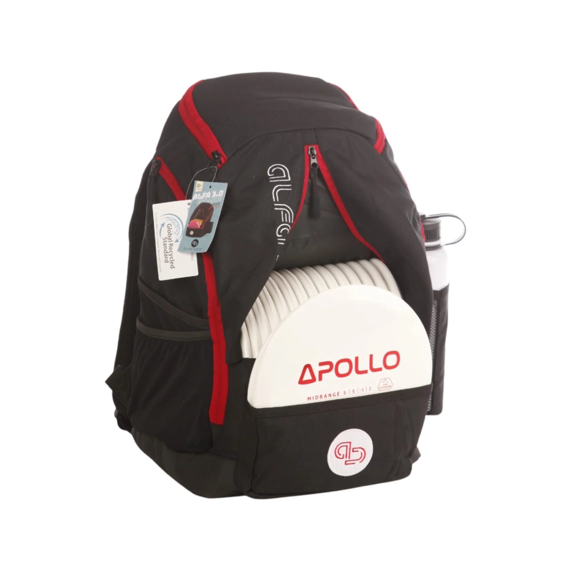 The main compartment of the Alfa 3.0 holds 18+ discs. An additional 2-3 discs can be stored in the putter pocket in front of the bag, with easy access. It has a top pocket you can fill with extra discs, clothes or other accessories. It also features a large sized water bottle holder and several side pockets for accessories.